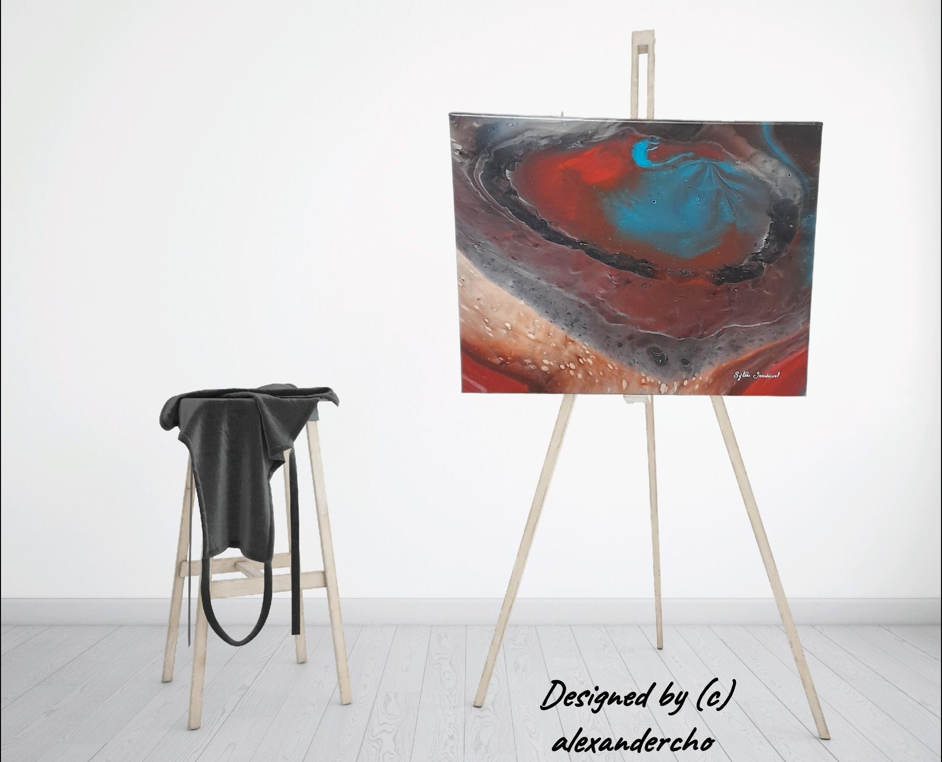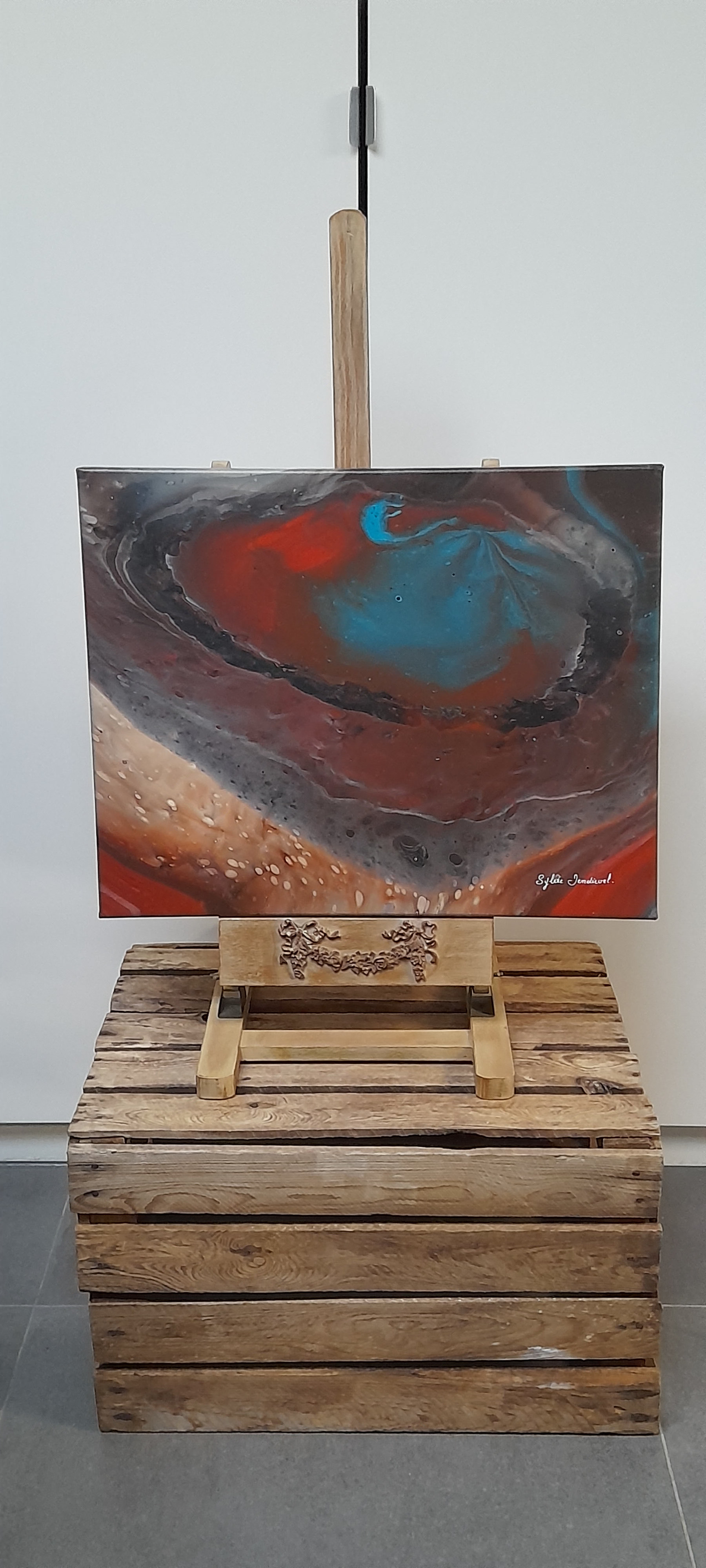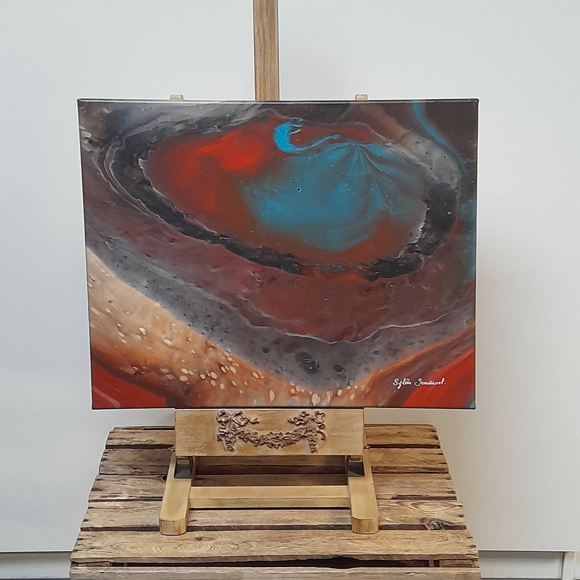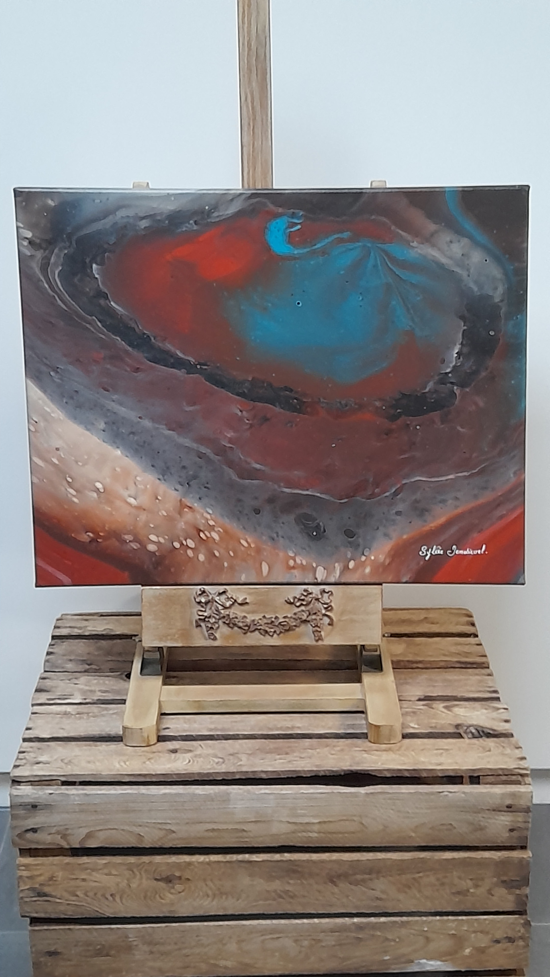 Mon interprétation : Les profondeurs du volcan vues sur ciel. Les couleurs et les détails créés par les cellules sont magnifiques. Mais l'interprétation de cette peinture sera différente selon l'imagination de chacun. C'est la magie de des techniques du pouring painting.