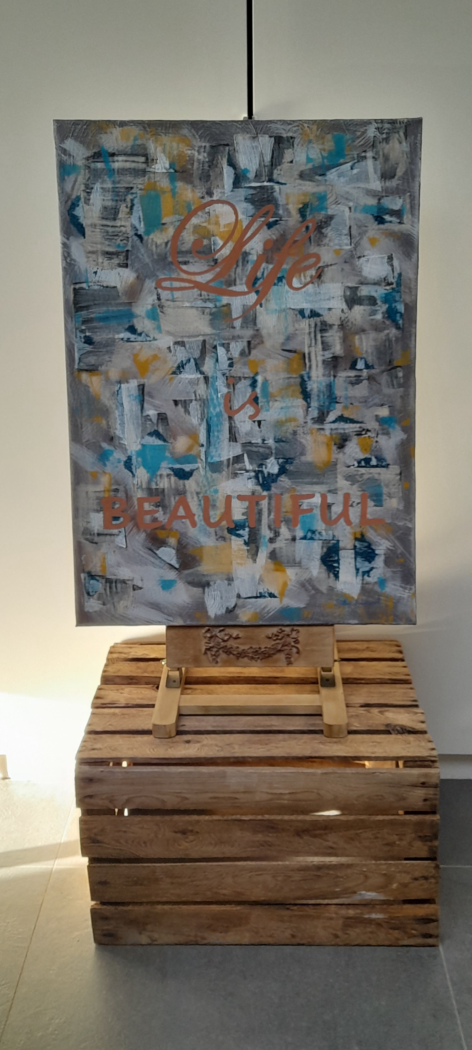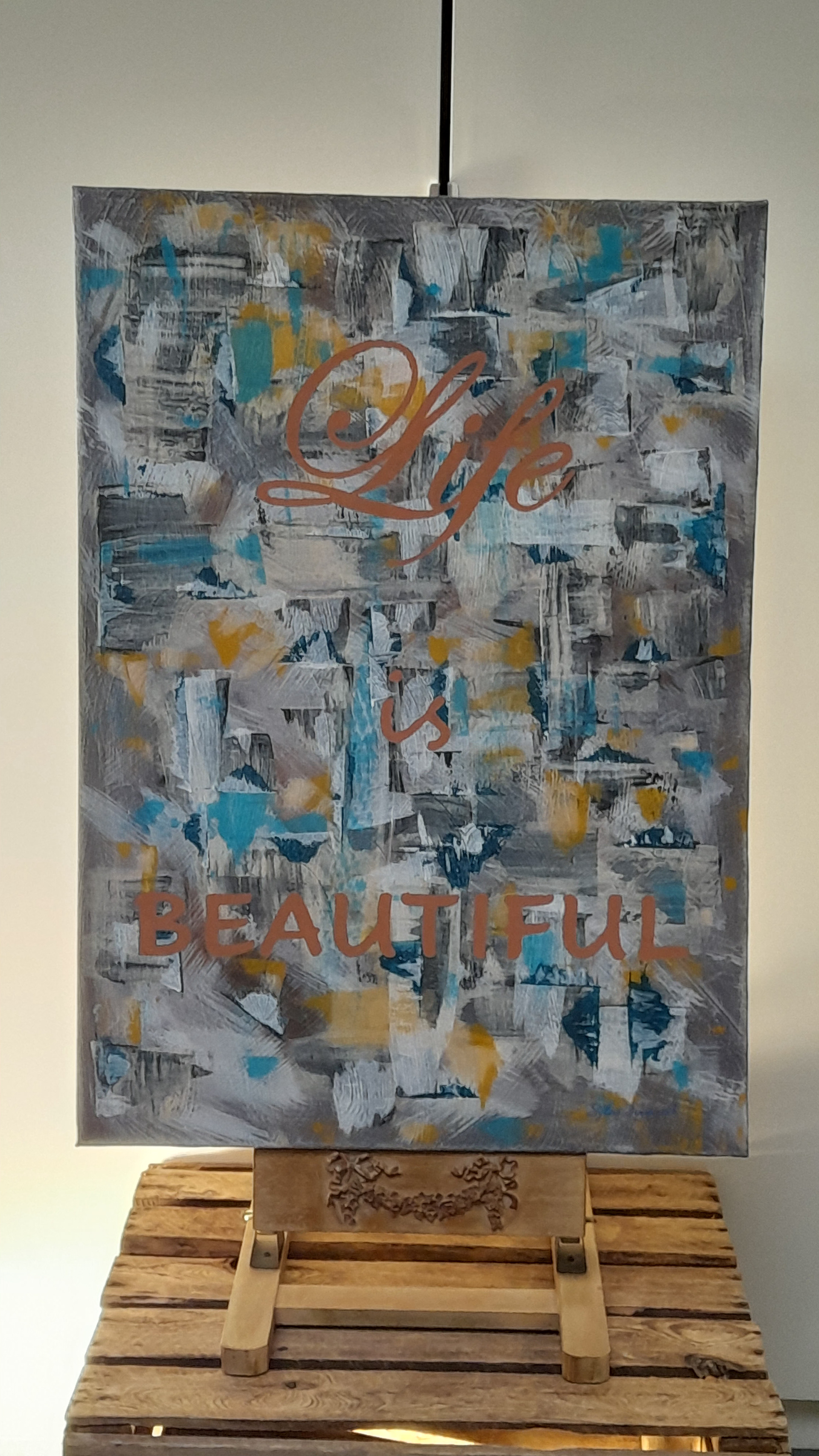 Mijn Interpretatie: De woorden "Het Leven is Mooi" zijn geschreven in acryl op een abstracte achtergrond met zachte tinten.