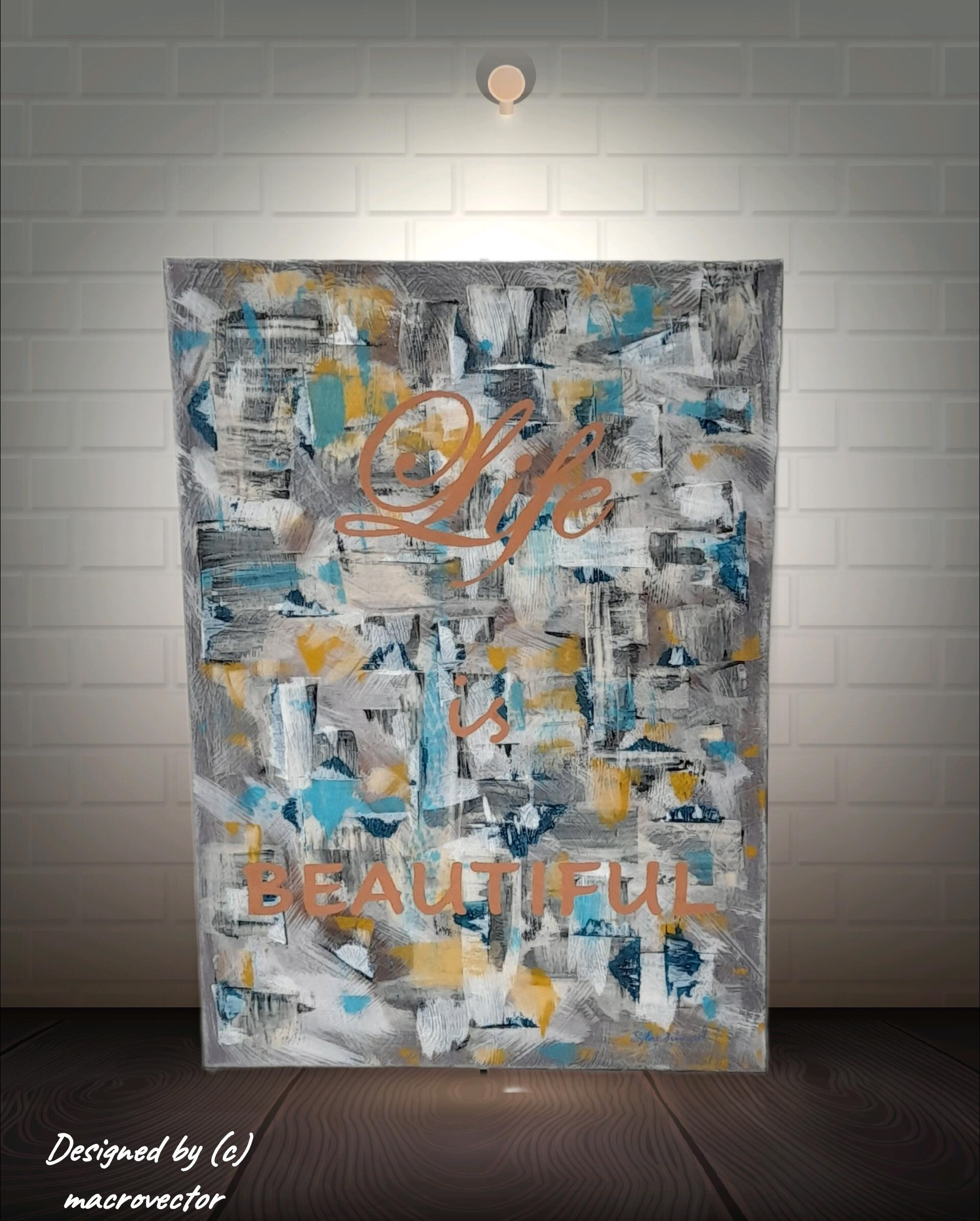 Mon Interprétation : Le message "La Vie est Belle" est calligraphié à l'acrylique sur un fond abstrait aux tons doux.